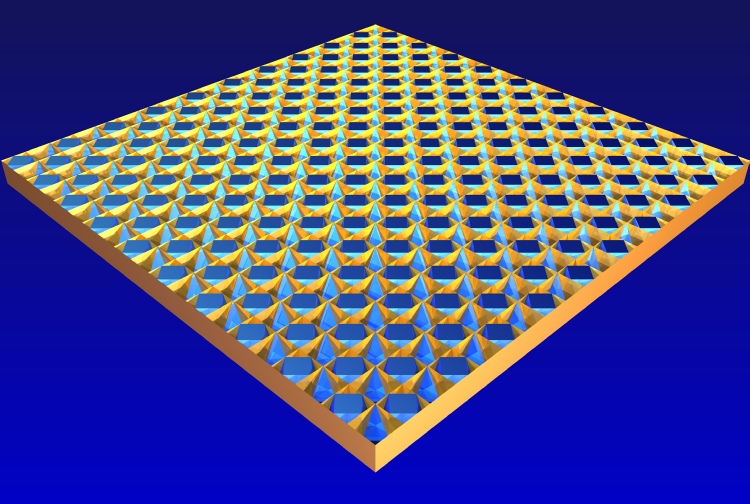 Tri-combTM panels use a unique self-balancing and self-reinforcing cellular matrix design.  The cells alternate 180° in orientation throughout the panels, allowing them to withstand extremely high stress applications by distributing applied forces efficiently and strategically.  All vertical walls are reinforced with triangle bracing and at least one buttress.  Every outside cell wall is supported by one buttress and 2 triangle braces.  All interior walls are supported by 2 buttresses (one on top and one bottom) and 4 triangle braces.  All internal square cells are reinforced by a total of 5 buttresses and 16 triangle braces, virtually eliminating weak points. This comprehensive and balanced 3D reinforcement allows Tri-combTM to utilize the strength of any material to full advantage.  As most of the panel is empty space due to the planar cell matrix architecture and does not  always require lamination to achieve its strength and rigidity, it  can be extremely lightweight - lighter even than honeycomb panels for the same or even more strength.  (Lamination will actually increase the strength of the panels, but usually lowers the overall material efficiency somewhat.)